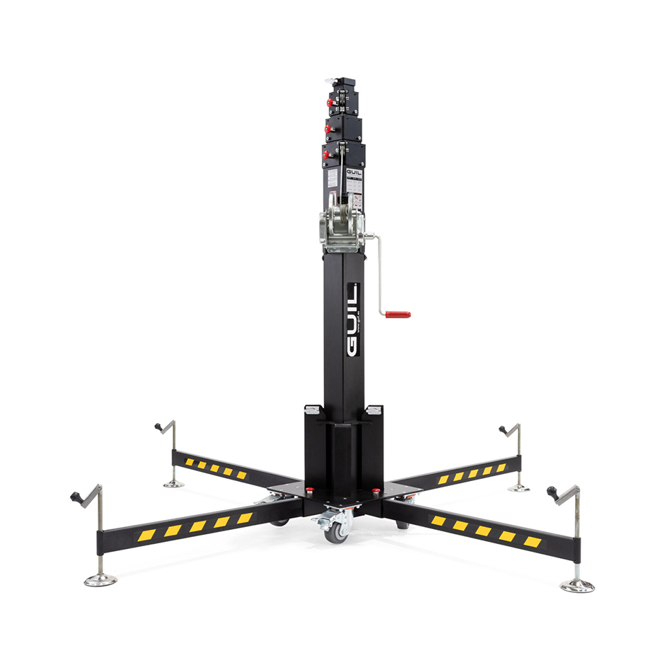 Torre telescópica profesional con capacidad de carga hasta 230 kg y altura máxima de 5,22 m. Ideal para rigging, montajes audiovisuales y estructuras truss en eventos.